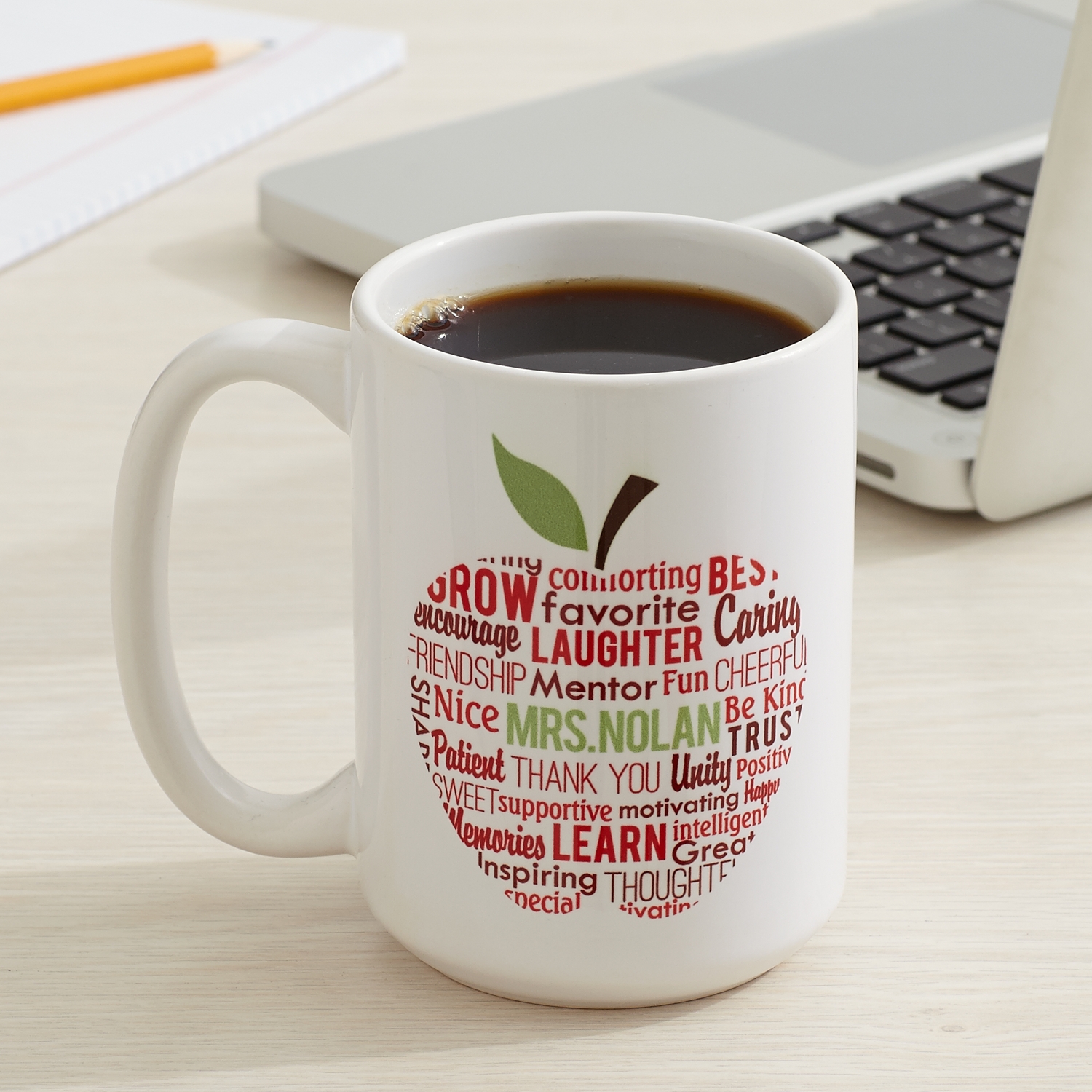 Product DescriptionPerk up teacher's desk with this new take on the classic "World's Best Teacher" coffee mug. Tasty, graphic apple design features his/her name surrounded by inspirational words and phrases.