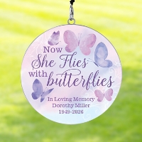 Memorialize someone no longer with us with this custom wind chime. If you close your eyes, you can hear the fluttering of butterfly wings, a gentle melody blowing in the breeze and the whispers of a loved one so dearly missed.