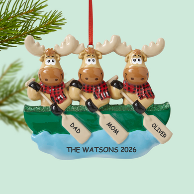 Paddle your moose family into the festive season with this charming ornament showcasing a cute 4-legged "North Woods" clan.