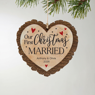 Celebrate the beginning of many Christmases together with this rustic wooden ornament, perfect for the newlywed couple you know.