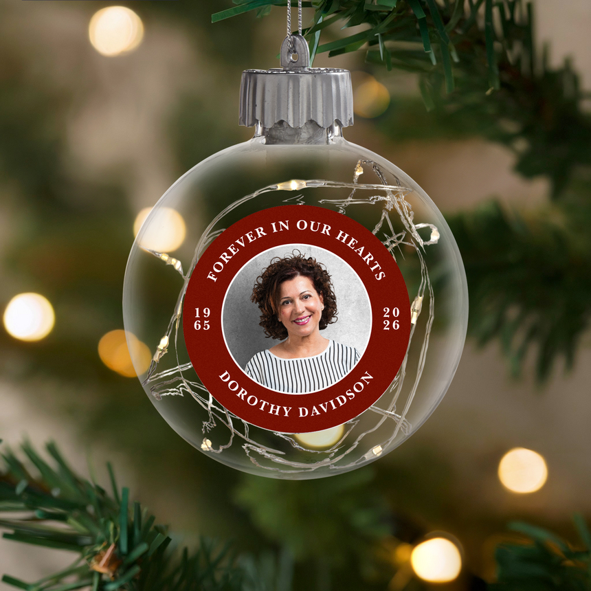 Brighten your holiday display with cherished memories. Gently illuminated by twinkling lights, this customized ornament offers a touching tribute to celebrate a treasured life and the enduring glow that remains in your heart.