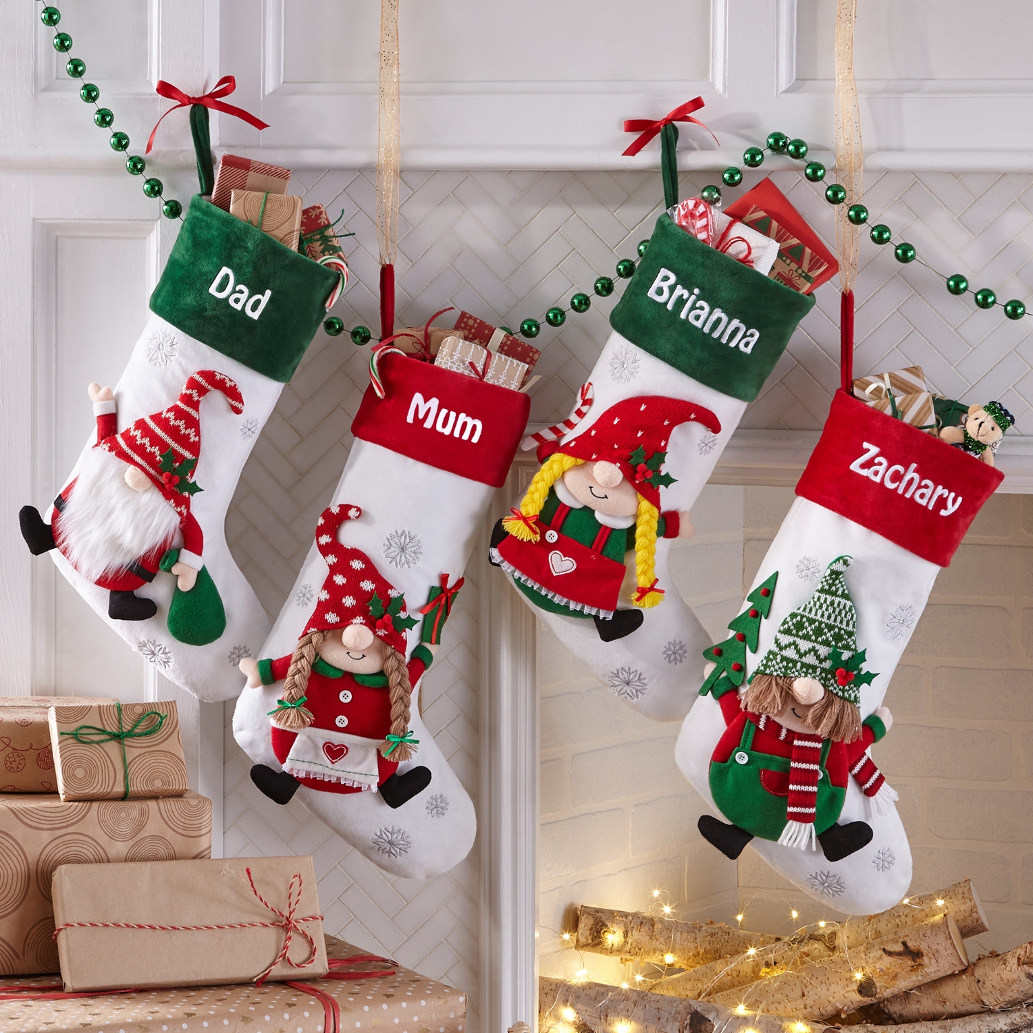 Product DescriptionFather Christmas….Go big or go Gnome! With plenty of room to fill to the brim, these adorably cute custom stockings are ready for Christmas morning. Choose a gnome for every member of the family!