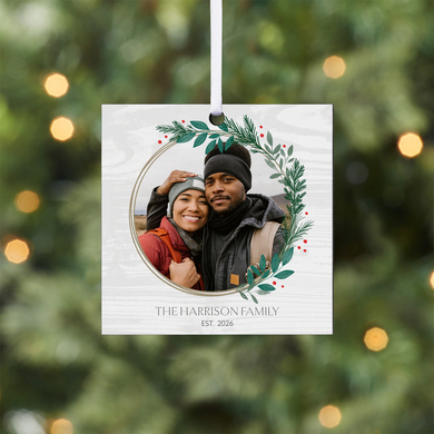 A circle of holly and berries adds a touch of timeless Christmas elegance to your cherished photo on this personalized holiday ornament.