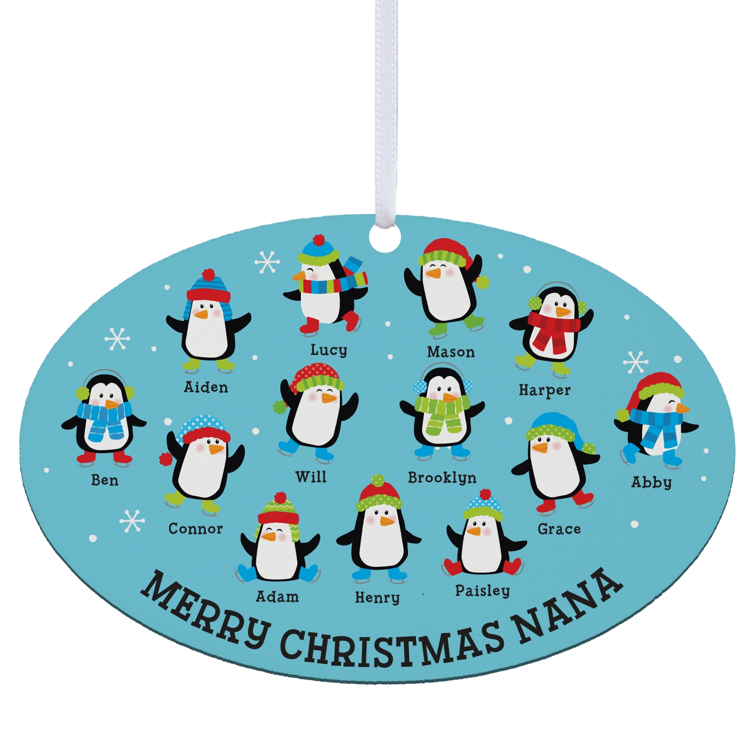 - Personalize with any 1 line message up to 20 characters and penguin icons (Small features 1 to 10 penguins; Large features 11 to 18 penguins) with names up to 9 characters each