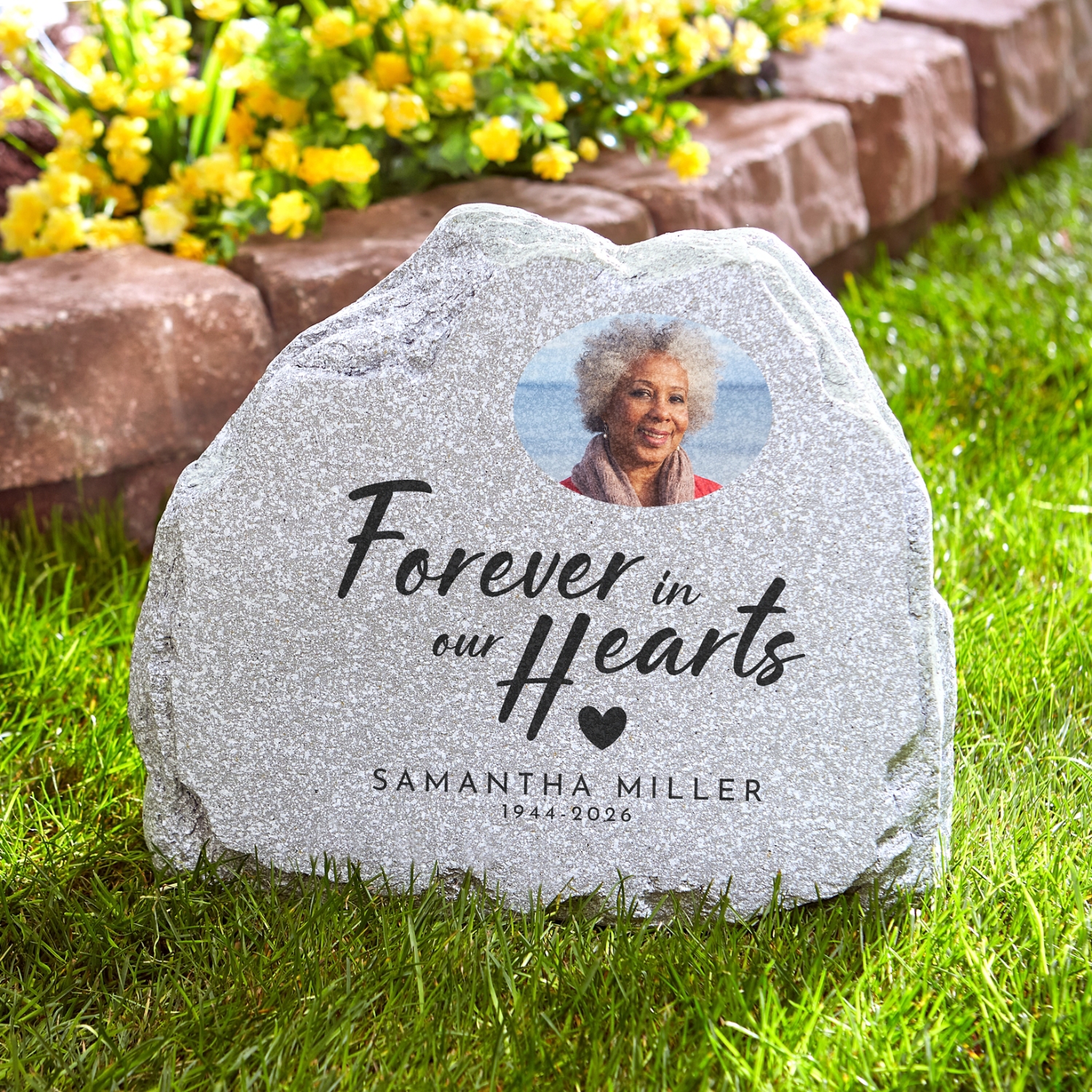 Create a serene space in your garden to remember and reflect on your cherished loved one. This beautiful memorial piece offers a touching tribute in a natural setting, customized with a personal photo.