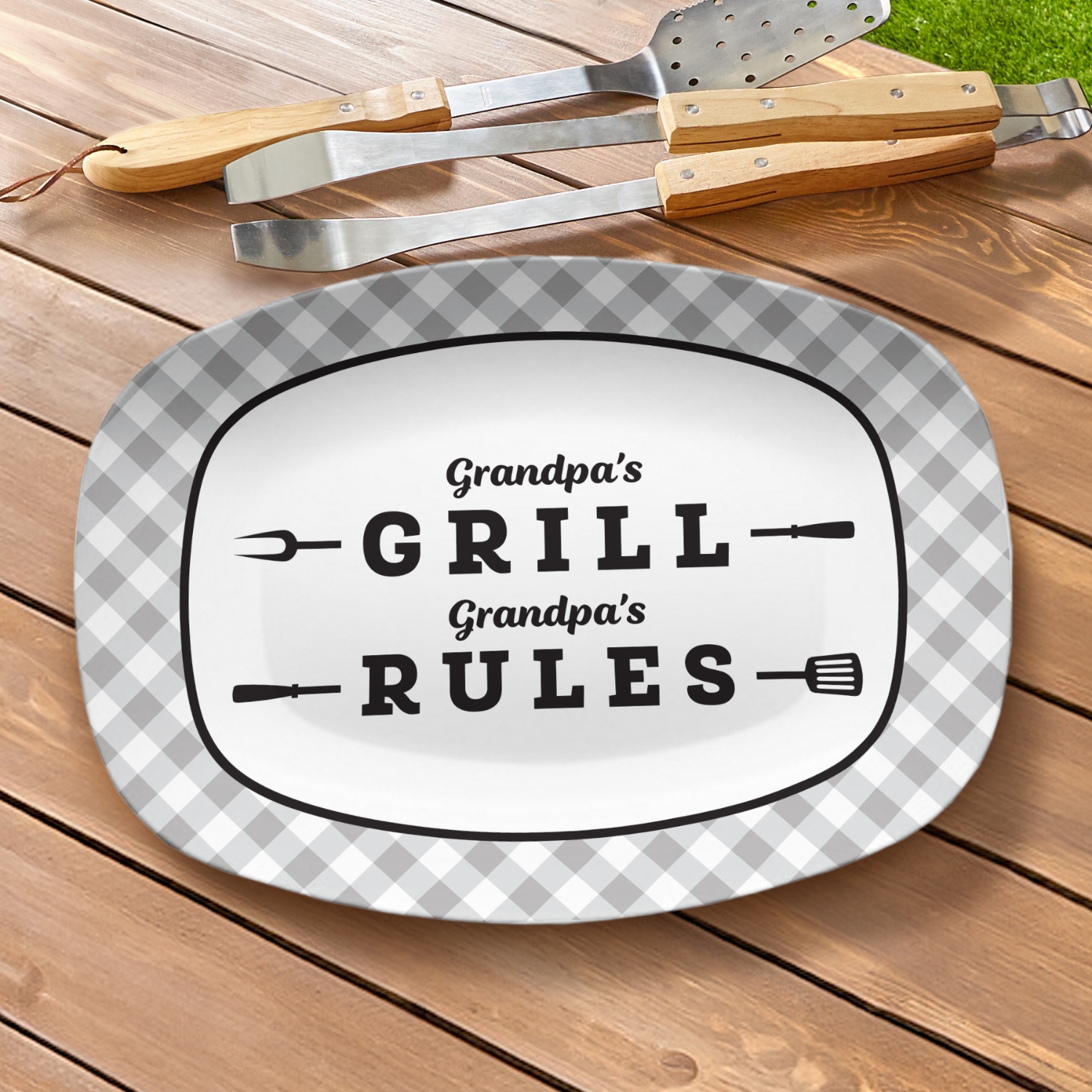 Product DescriptionElevate dad's grilling game with this witty, personalized serving platter. Perfect for the BBQ enthusiast who loves to showcase their culinary creations, this platter adds a touch of humor to any outdoor feast. Whether it's loaded with juicy burgers or perfectly seared steaks, it's sure to make dad feel like the true king of the grill.