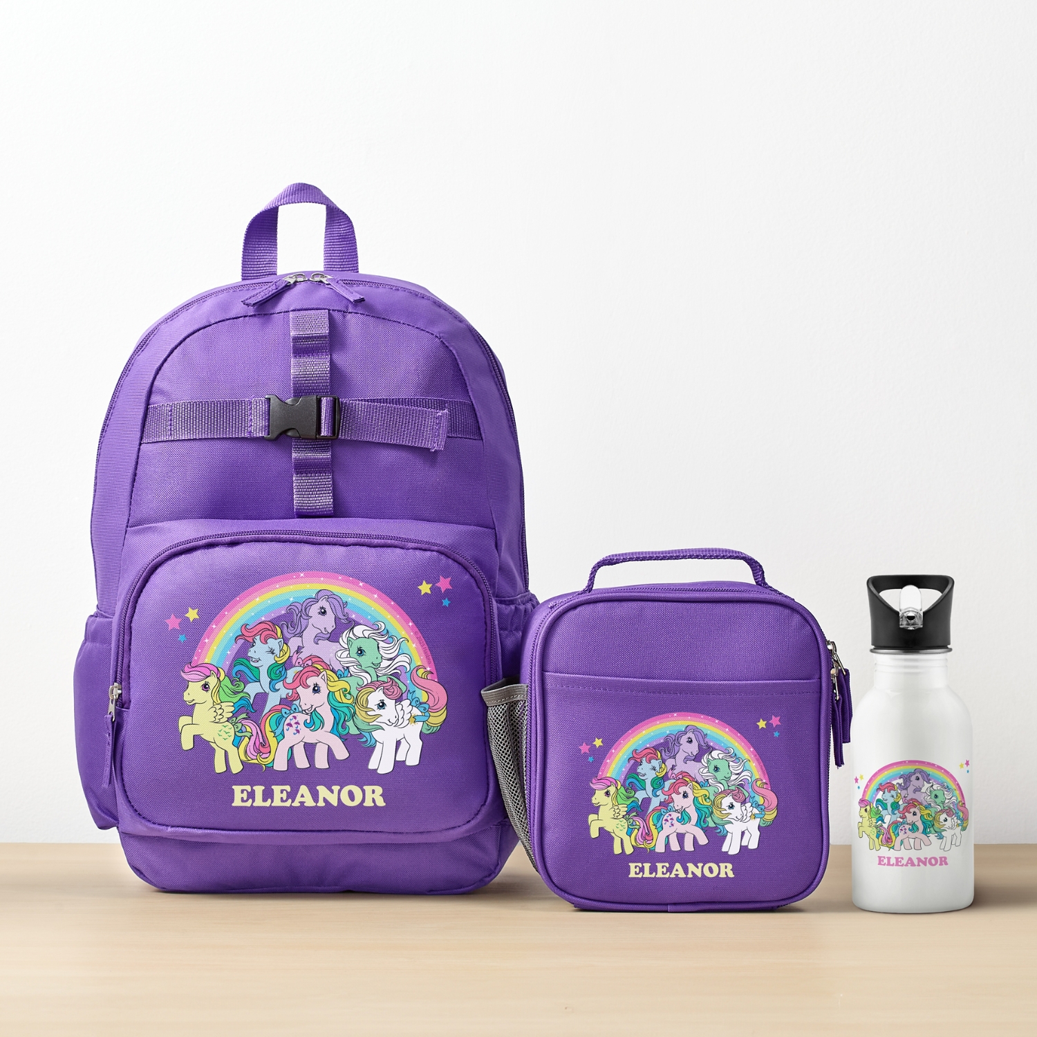 Bright, fun and built for every adventure. This personalized collection features vibrant designs with all of your child's favorite ponies. Each backpack offers plenty of space for school essentials, snacks and more. This backpack set brings a splash of magic to every day, and makes gettting ready for school a little more fun!