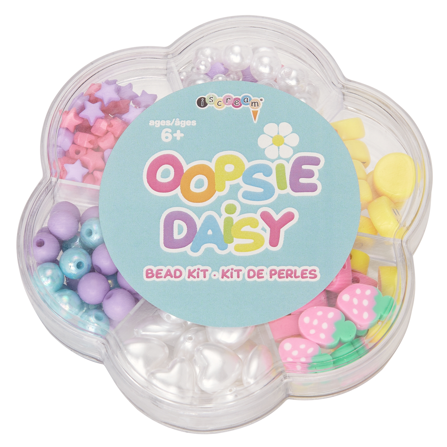 • Includes colorful assorted beads and elastic in a plastic daisy-shaped container