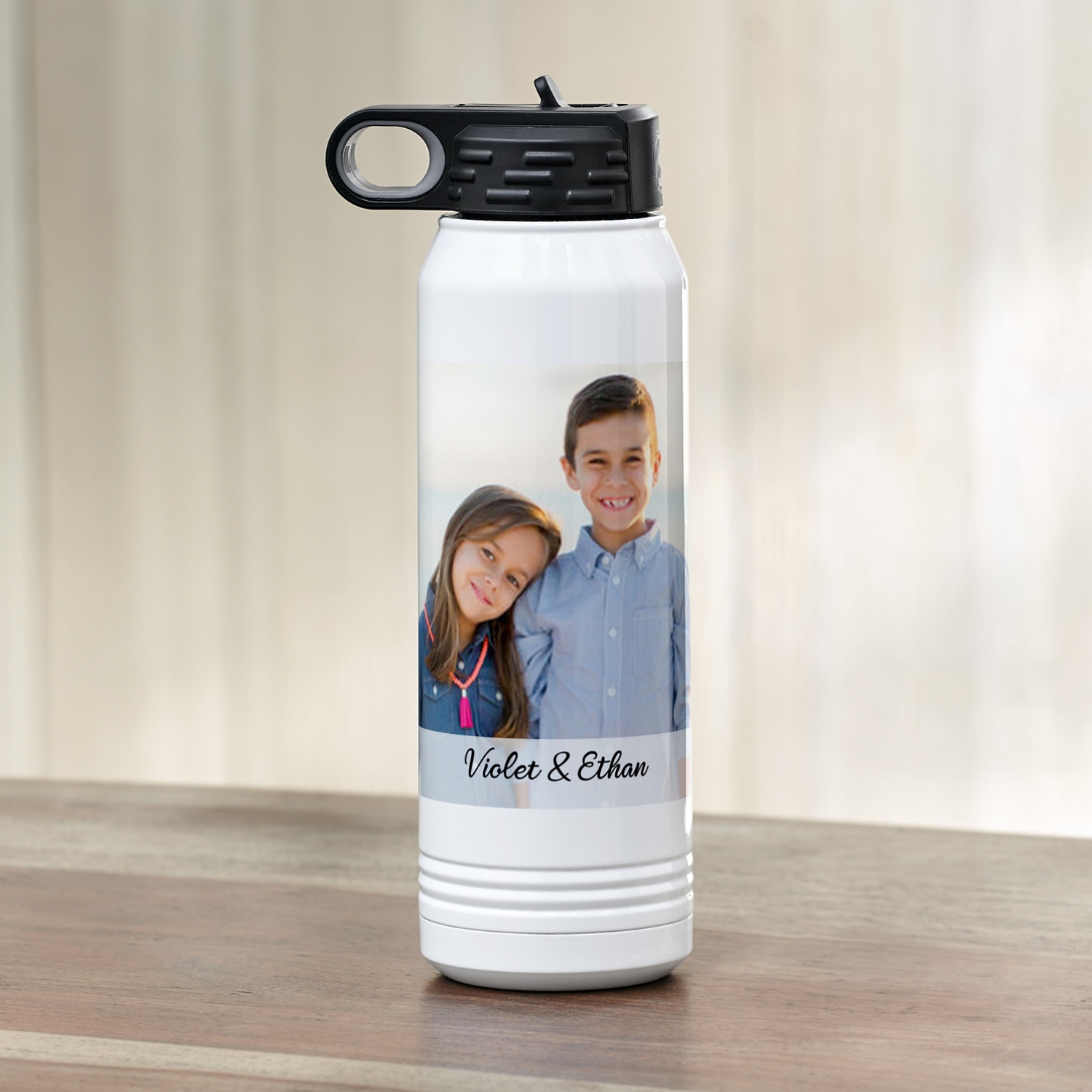 Customize this convenient water bottle with your favorite image and keep yourself refreshed throughout the day with a truly unique accessory.