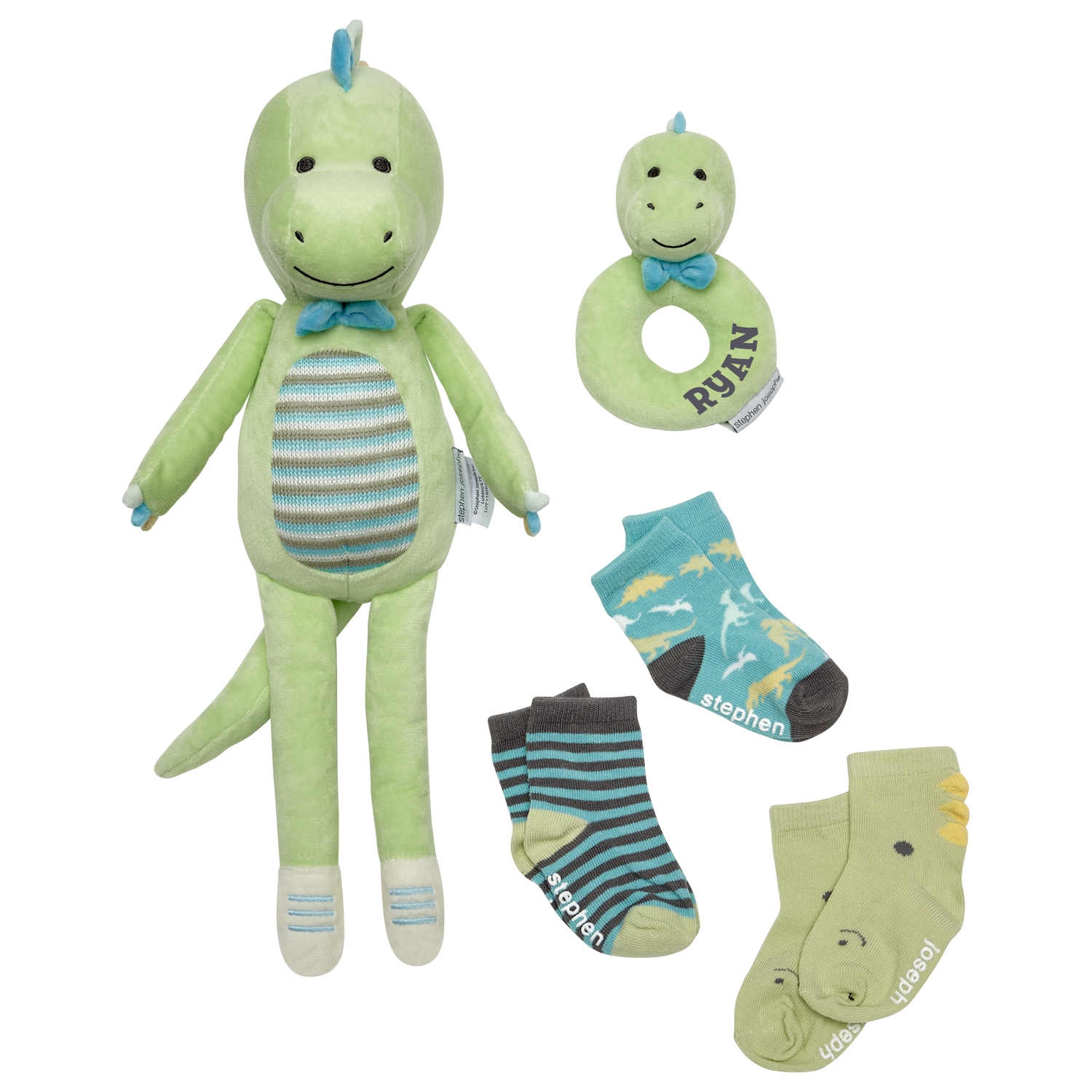 Product DescriptionWelcome a new baby with these adorable matching must-haves! Featuring a cuddly plush animal personalized with their very own name, a rattle and baby socks, this gift set will make them the star of the stroller crowd.
