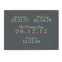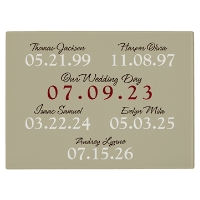 - Customize with 3 to 6 names (up to 20 characters each), up to 6 dates, a center message (up to 20 characters), and 1 milestone date (up to 8 characters; displayed in a different color text)
