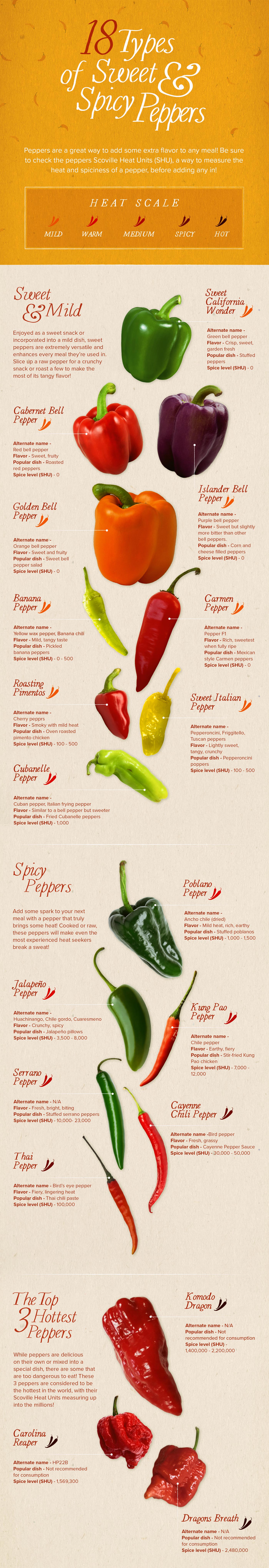When choosing the perfect pepper, be sure to consider the ingredients you’ll be combining. Peppers are rated using Scoville Heat Units (SHU), a way to measure their heat/spiciness. The units can range from 0 to 100 (sweet peppers) and all the way up to 3,200,000 (dangerously spicy peppers).