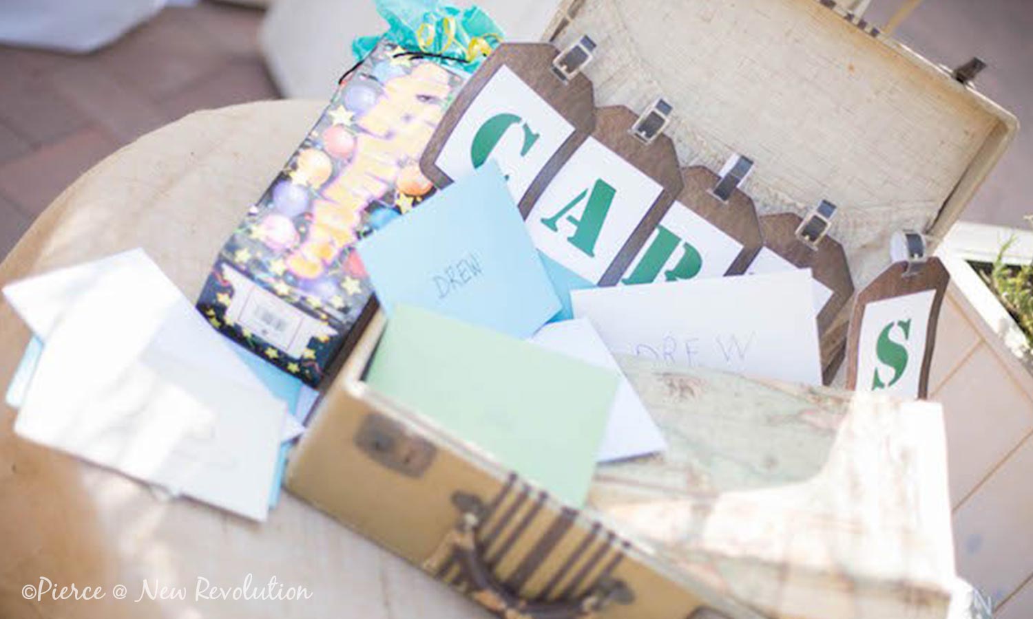 New Revolution Media took this shot of an adorable suitcase card box. Make sure your guests know where to place their gifts by recreating this clothespin and string detail displaying the “cards” sign.