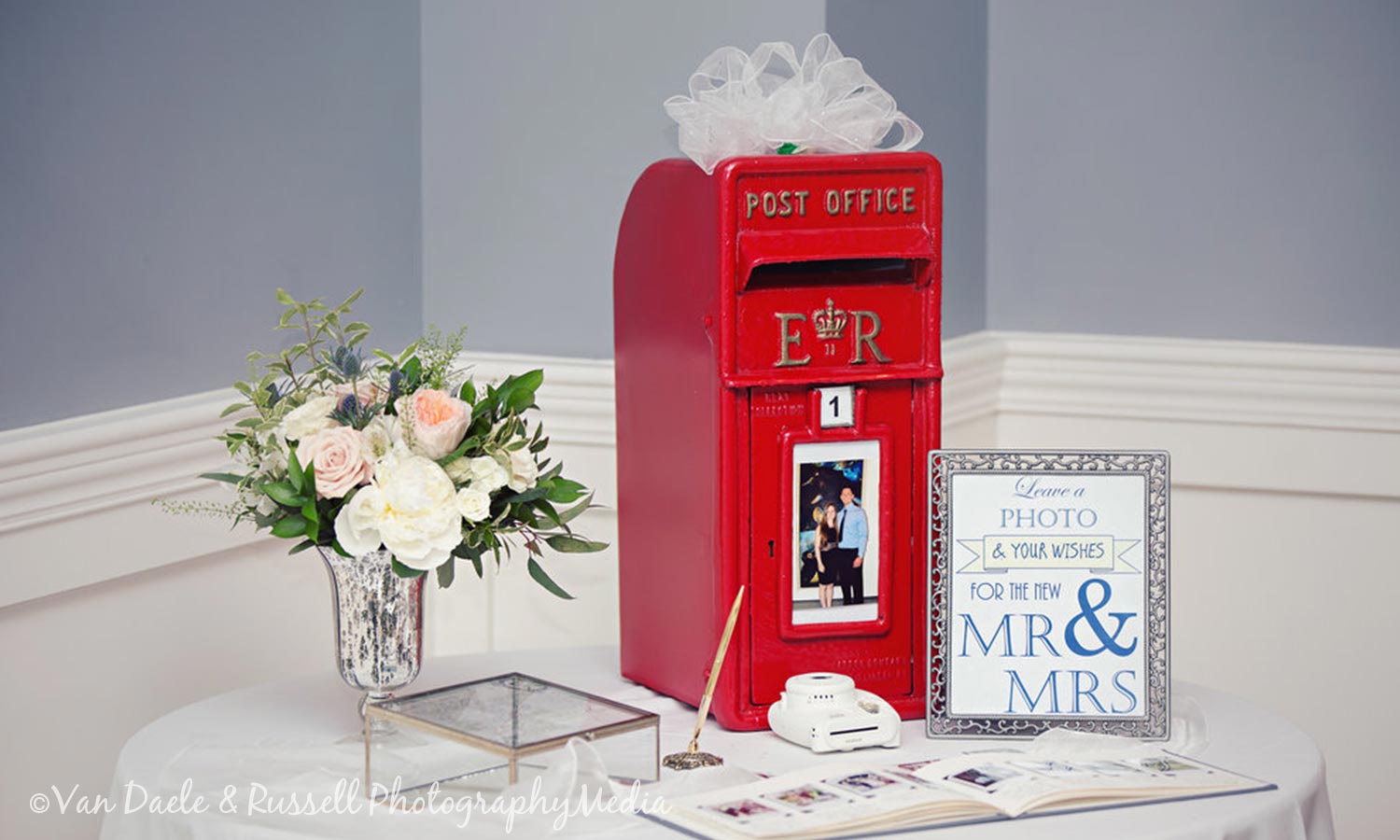 Stir up feelings of cobbled London streets with this post box card holder. Van Daele & Russell Photography captured this couple’s gorgeous display. This glossy red post box looks stunning against their muted blue and gray color palette.