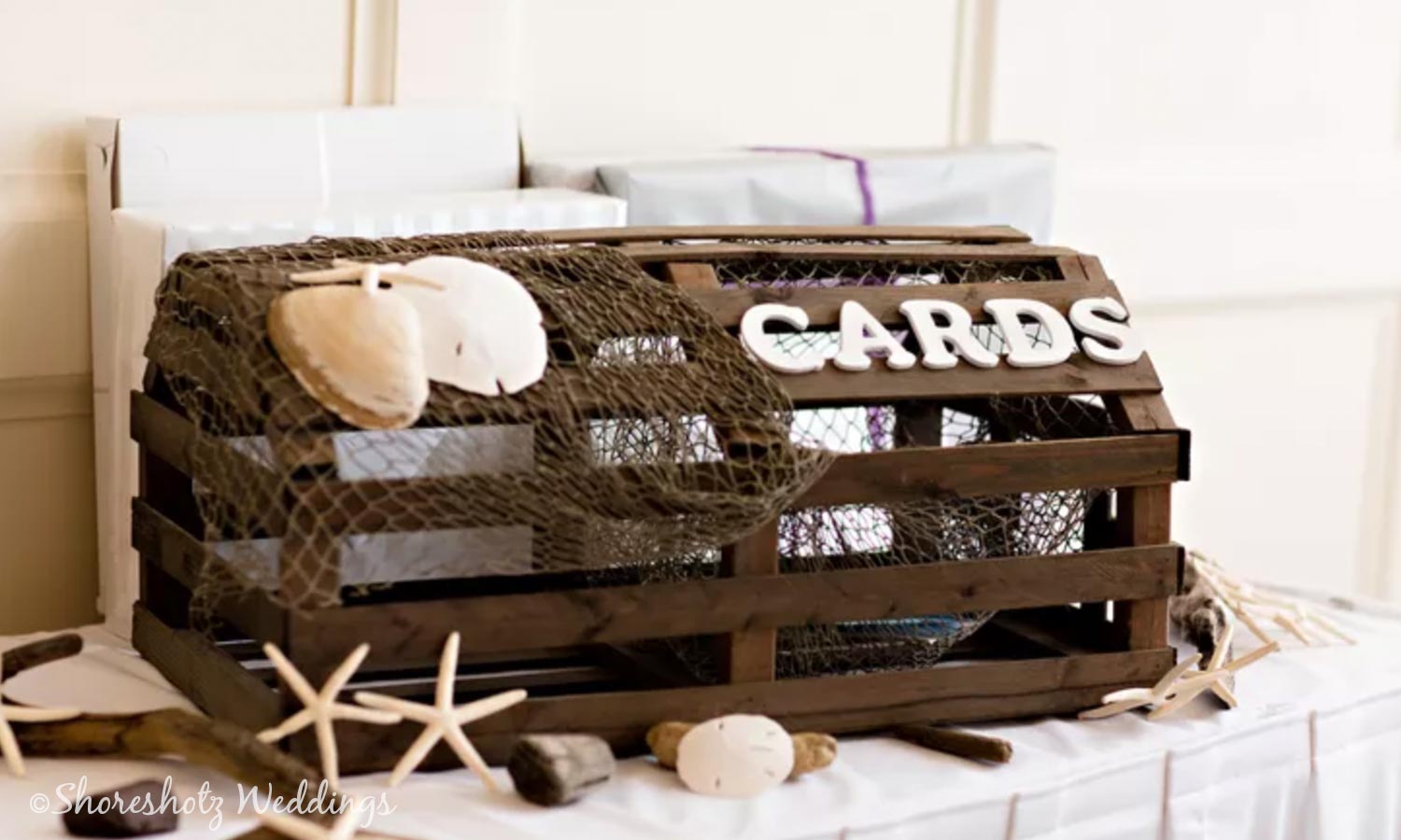 If your heart belongs to the sea, this lobster trap card box, captured by Shoreshotz Weddings, is for you. Decorate it with shells, netting and other beach treasures to pay your homage to the ocean.