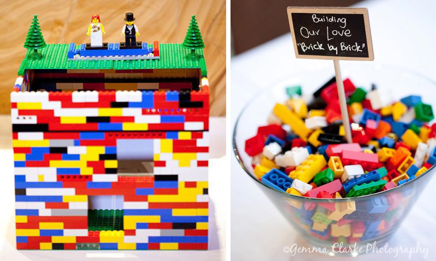 Show off your playful side by building a card box with colorful toy bricks, like this one from Gemma Clarke Photography. This is an adorable eye-grabber that will please young and old alike. This couple kept the theme going by offering their guests extra blocks to play with during cocktail hour.