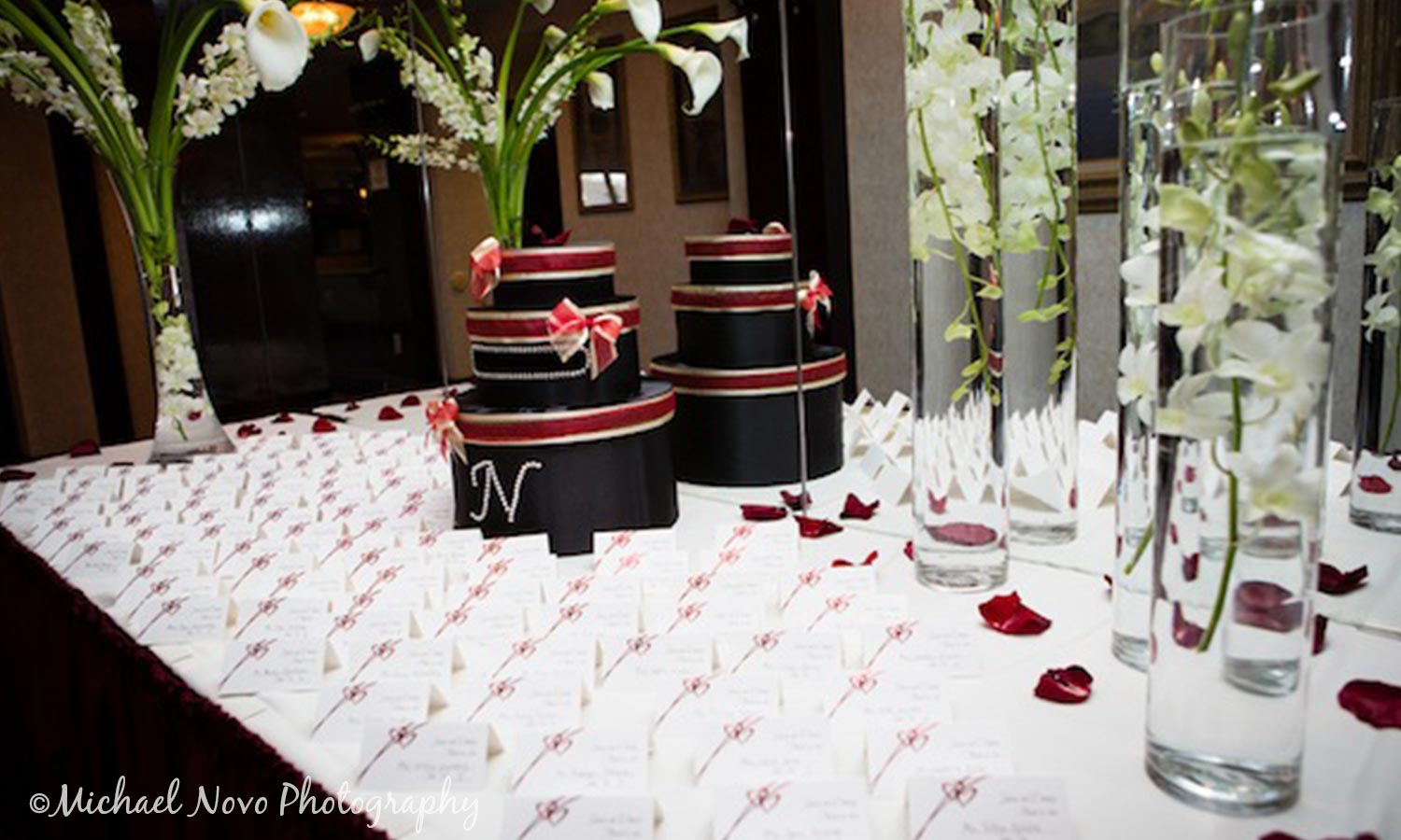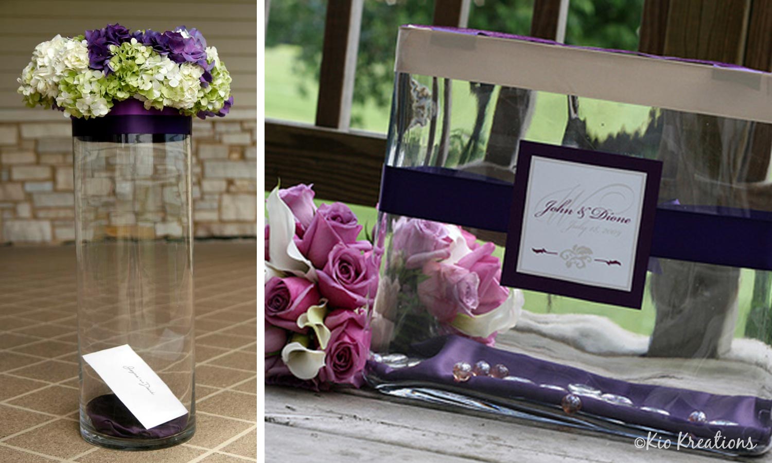 Glass vases will add class and elegance to your card holder display. These vases, designed by Kio Kreations, feature sophisticated purple ribbons and custom monograms. Use extra flowers to decorate the rim of the vase.