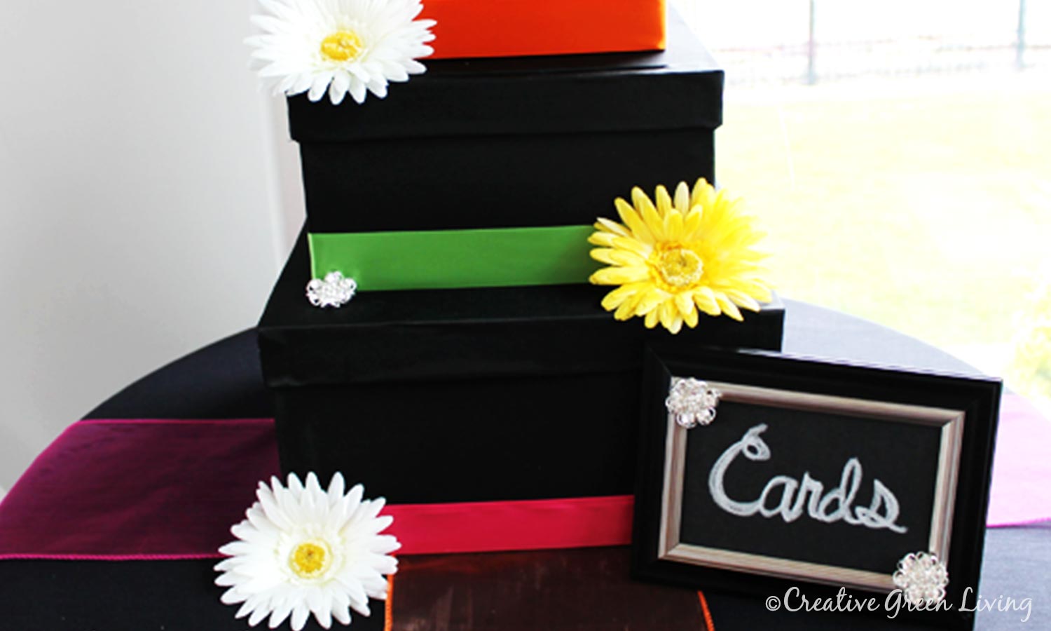 Put a unique twist on the typical 3-tier card box by adding bright pops of color throughout. This DIY tutorial by Creative Green Living is a great place to start. Its simple and stylish design is easy to customize to your theme and colors.