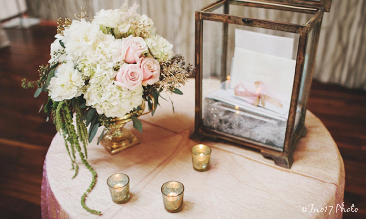 This couple achieved the perfect balance of sophistication and romance. The display, photographed by Two17 Photo, features a glass box card holder with copper detailing. Roses, hydrangeas and small candles add a soft, romantic glow to the table. Simply gorgeous!