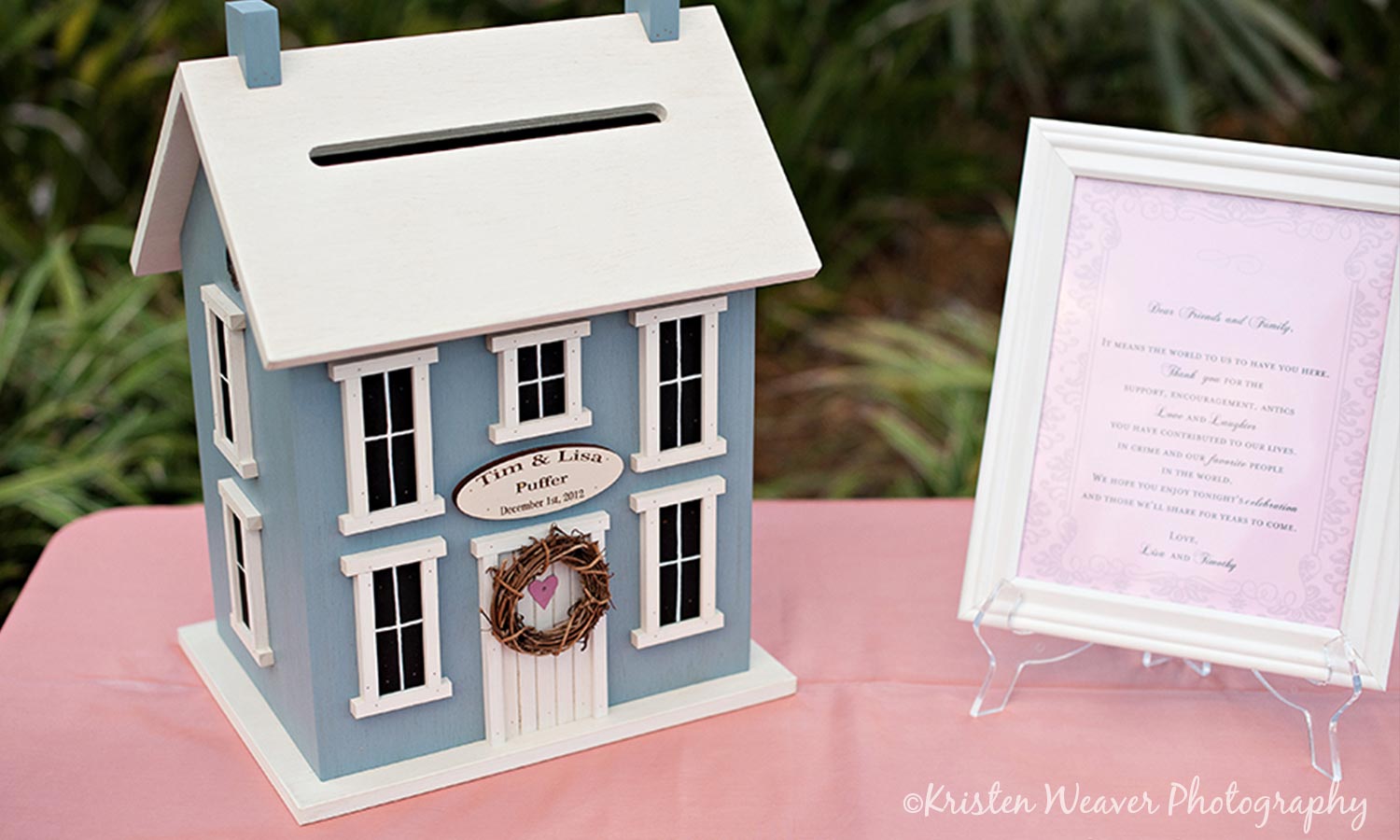 Who said a card box has to be just a plain old box? This mini cottage, photographed by Kristen Weaver Photography, takes quaintness to a new, adorable level. You can even add a little wreath or window boxes!