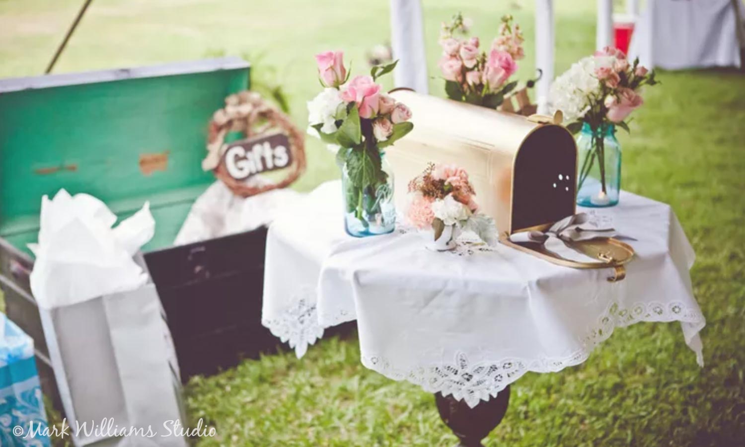 Spice up your gift table with a painted mailbox. This display, photographed by Mark Williams Studio, perfectly blends glamour and gold with a feminine tablecloth and blue tinted mason jars. If you opt to use a small table, add a box trunk to hold large wedding gifts.