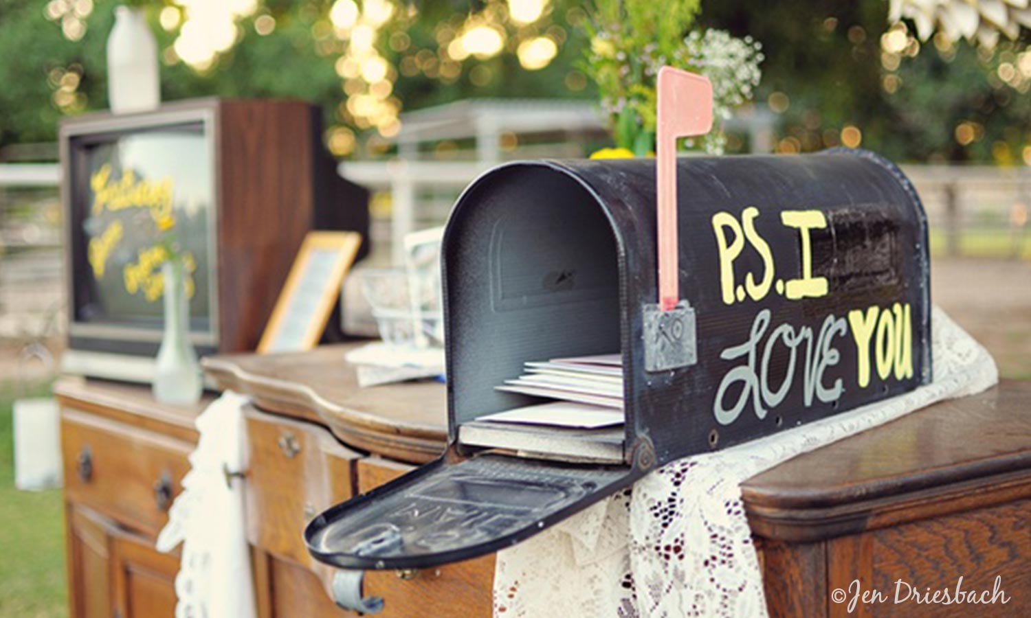 Are you aiming for a rustic feel? Opt for a personalized mailbox like the one that Jen Driesbach captured. Write sweet messages in acrylic paint for a seriously adorable custom card holder.