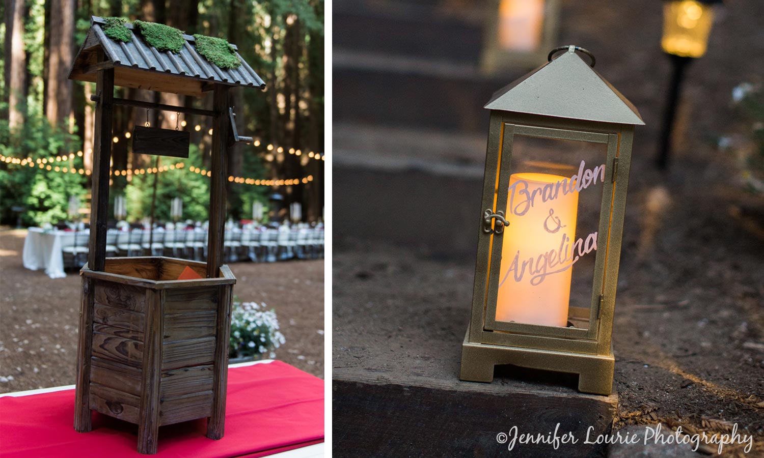 Have your guests place their gifts and well wishes into this wishing well style card holder! The cozy wood and moss details make this piece, photographed by Jennifer Lourie, right at home in a forest wonderland. Create an even cozier environment with fairy lights and lanterns lining your guests’ path.