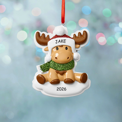 Embrace the charm of this personalized holiday ornament featuring an irresistible little moose. This delightful decoration will bring joy to your festive celebrations for years to come.