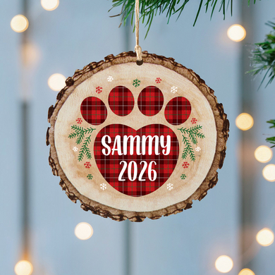 Plaid Paw Print Rustic Wood Personalized Round Ornament